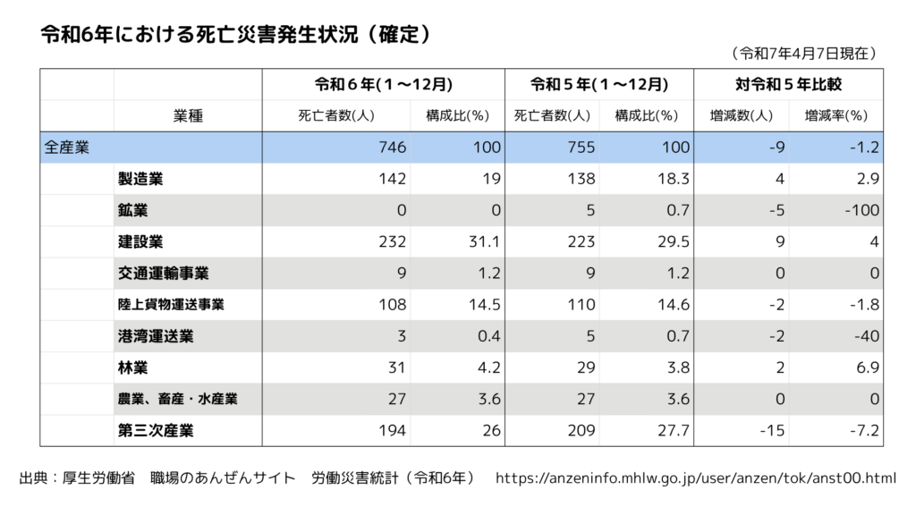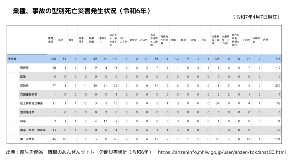 厚生労働省の「職場あんぜんサイト」における労働災害統計(令和6年)を見ると、労働災害統計確定値は、全産業合計で748名でした。