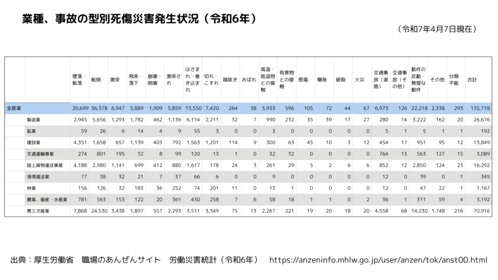また、同じく厚生労働省の「職場あんぜんサイト」における労働災害統計(令和6年)からわかるのは、死傷災害は建設業で13,849人にも上るということです。(死亡災害及び休業4日以上の死傷災害)